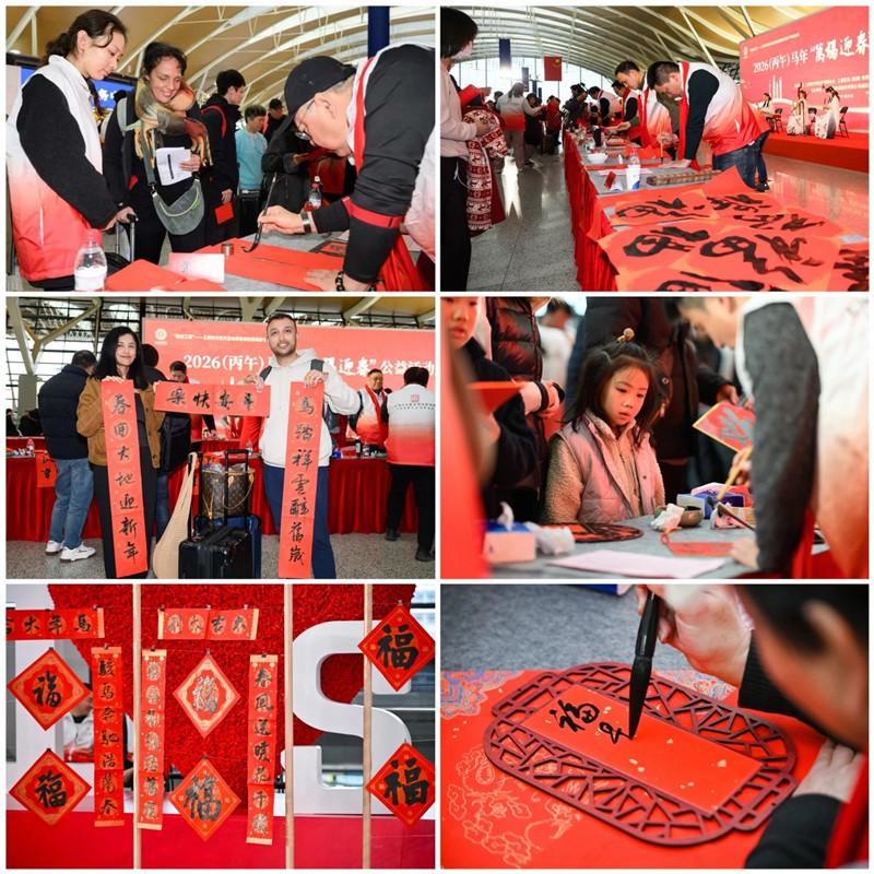 The 2026 Spring Festival public benefit event launched at Pudong Airport's Terminal 2 on Jan 20. Co-hosted by the Shanghai Federation of Literary and Art Circles, the Shanghai Calligraphers Association, and Shanghai Airport Authority (AVINEX), the event marks the start of the city's annual cultural activities.