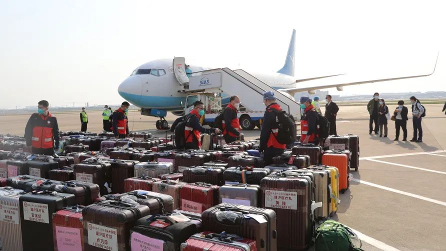 机场贵宾服务在值守人员有限的情况下,安排骨干进行重点保障,从下午直至忙碌到深夜。她们承担了团队迎送、引导、协助提取行李等工作,用温馨的问候和规范的礼仪,向援沪医疗队送上热情服务和感谢。