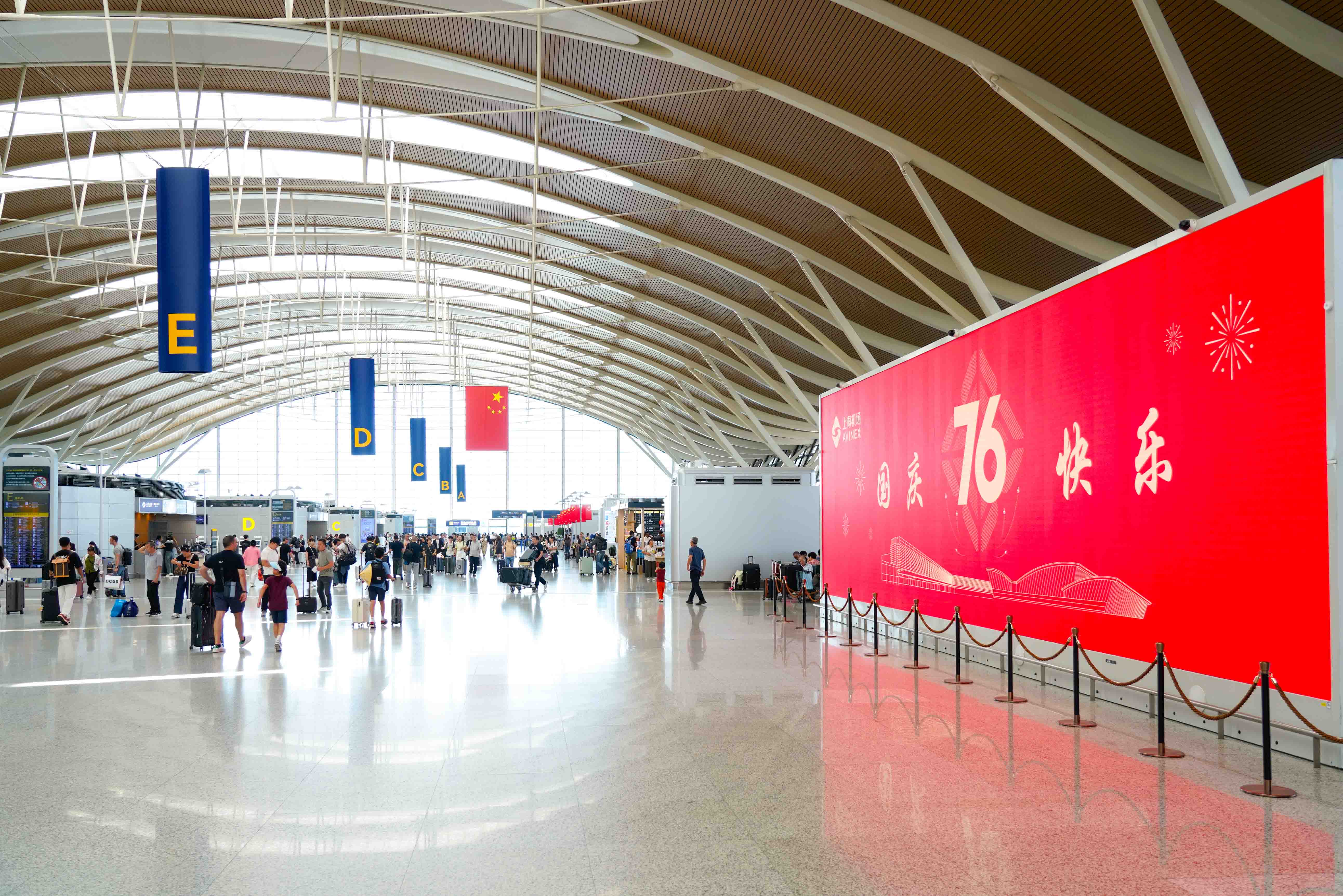 8天的假期带动了出境游、国内游中长线旅游的增长,免签政策扩大效应也让上海成为外国游客最热门目的地。节日里,浦东、虹桥两大机场遍布“中国红”,五星红旗、中国灯笼遍布进场高架、问询值机柜台、安检通道各区域,节日主题打卡点和景观点位吸引旅客驻足打卡。